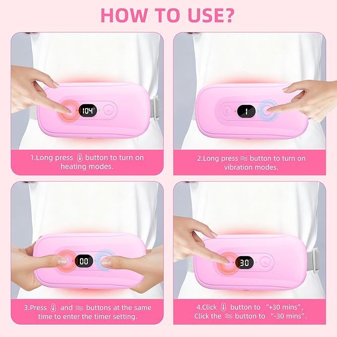 Fast Heating (5 Seconds): Heats up almost instantly for quick relief. Rechargeable & Portable: Cordless design with Type-C fast charging Adjustable Heat Levels: 3 temperature settings (113°F, 131°F, 149°F) Massage Function: 3 vibration modes for added comfort Auto Shut-Off Safety: 30-minute timer for worry-free use Adjustable Fit: Elastic belt fits up to 55 inches Soft & Comfortable Material: Skin-friendly velvet fabric Long Battery Life: Lasts 2–5 hours per charge Travel-Friendly: Lightweight and easy to carry anywhere